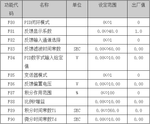 當(dāng)變頻器需以PID閉環(huán)方式運(yùn)行時(shí),F(xiàn)80功能代碼參數(shù)應(yīng)設(shè)定為1,F(xiàn)80=1。